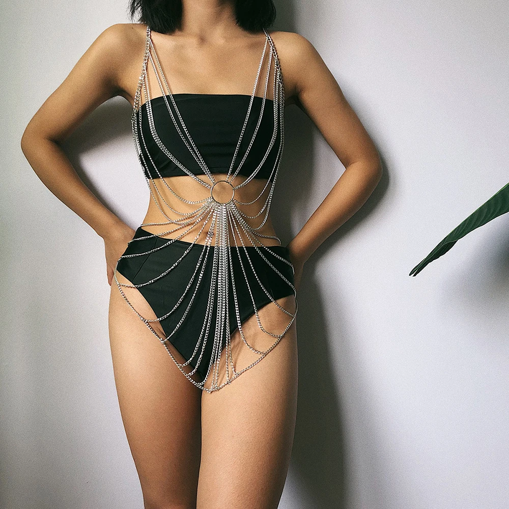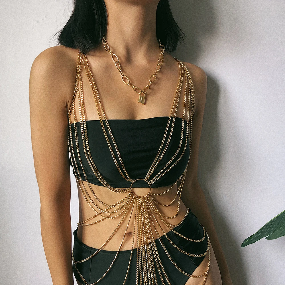 [[SPECIAL OFFERS]] Gold Silver Beach Chain Body Jewelry Sexy Multi layer Fringe Ring Body Chain Beach Bikini Crossover Chest Jewelry for Women Online